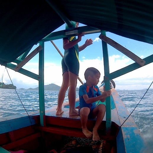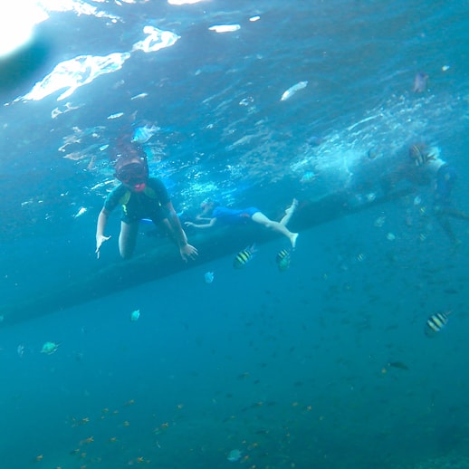 Walau si penyewa perahu mengklaim bahwa di wilayah tersebut tidak ada ikan ganas (hiu, barakuda, dan sejenisnya), namun saya dan Trias tetap siaga penuh memperhatikan bocah-bocah mencoba snorkeling di permukaan sampai menyelam ke dasar laut tanpa pelampung. Apalagi, arus dan gelombang lautnya membuat posisi berdiri kita, terutama anak-anak, tanpa disadari bergeser.
